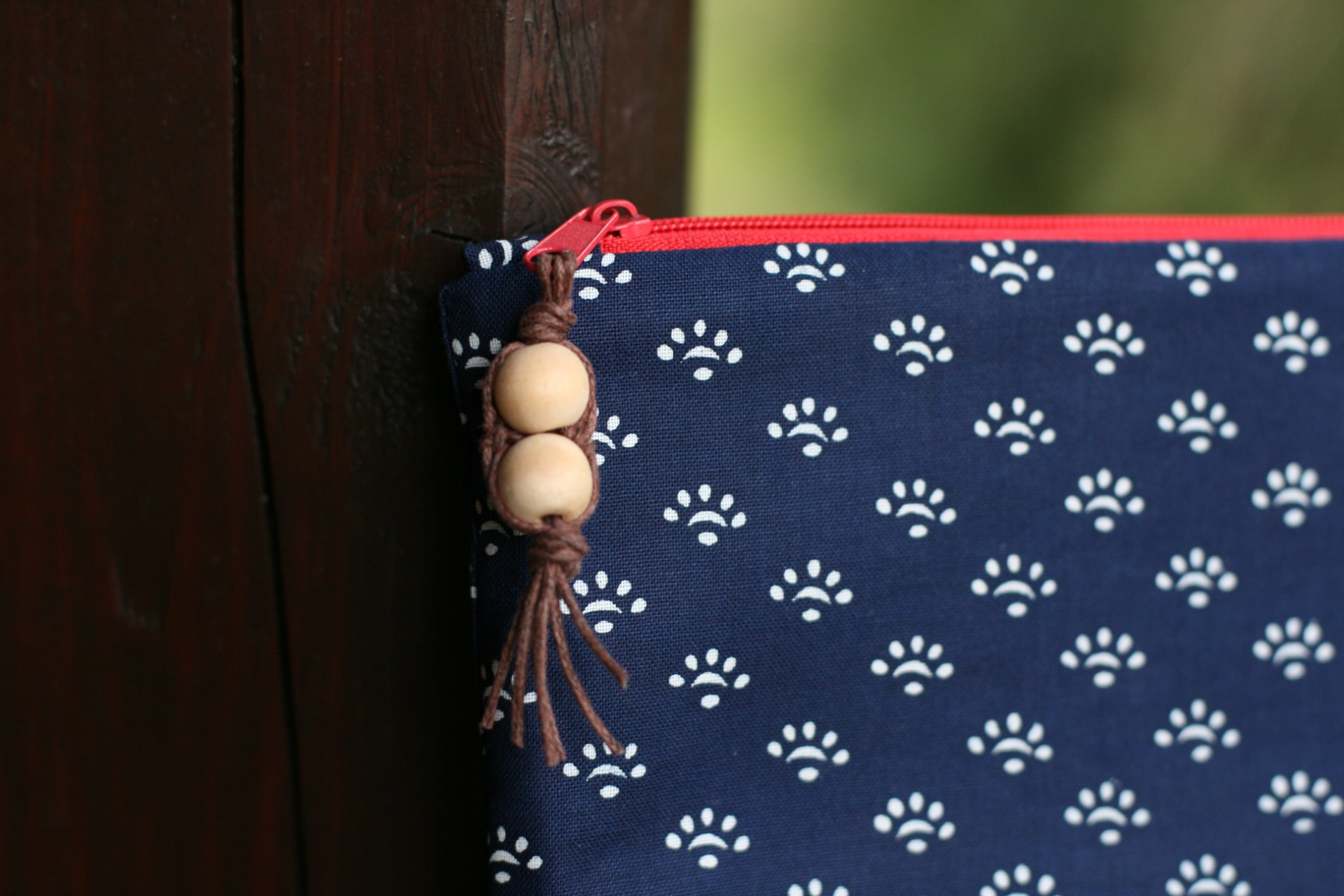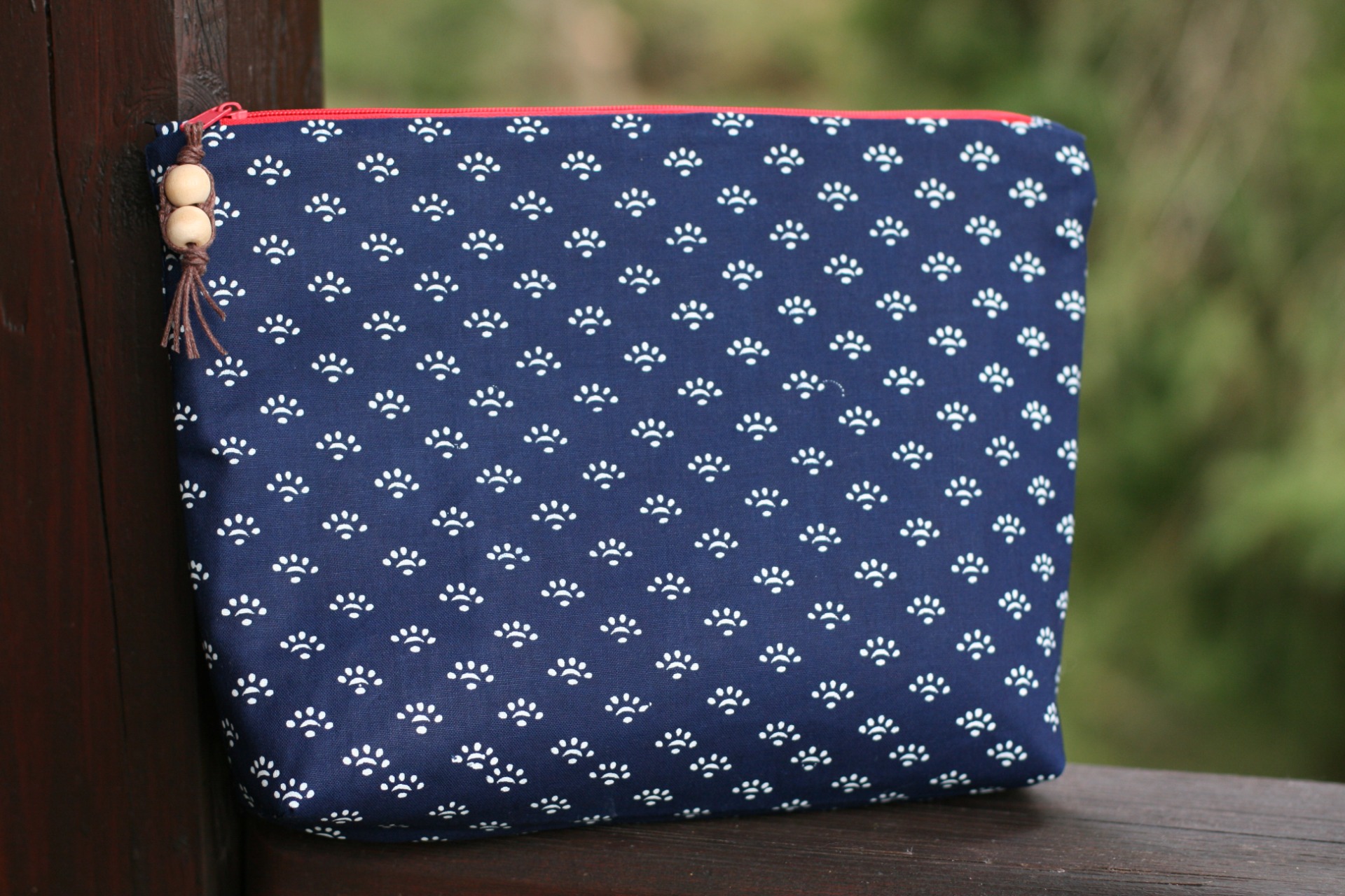 Toaletní taštička pro náročnější ženy. Venkovní potah z plátna s modrotiskovým vzorem a ručně obarvené indigem v původní modrotiskové dílně v České republice. Vnitřní podšívka je z recyklované bavlny. Střapec na zipu je vyroben z voskované šňůrky a s dřevěnými korálky.